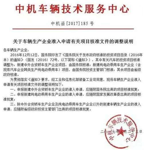 中機(jī)中心發(fā)布《關(guān)于車輛生產(chǎn)企業(yè)準(zhǔn)入申請(qǐng)有關(guān)項(xiàng)目核準(zhǔn)文件的調(diào)整說明》,為貫徹落實(shí)《國務(wù)院關(guān)于發(fā)布政府核準(zhǔn)的投資項(xiàng)目目錄(2016年本)的通知》的要求,將車輛生產(chǎn)企業(yè)準(zhǔn)入申請(qǐng)有關(guān)項(xiàng)目核準(zhǔn)文件作了調(diào)整說明。其中,除中外合資轎車生產(chǎn)企業(yè)及純電動(dòng)乘用車生產(chǎn)企業(yè)以外的新建車輛生產(chǎn)企業(yè)的準(zhǔn)入申請(qǐng)(這里面包括新建商用車、專用車生產(chǎn)準(zhǔn)入申請(qǐng))由省級(jí)政府核準(zhǔn),應(yīng)隨附省級(jí)政府投資主管部門出具的項(xiàng)目核準(zhǔn)批復(fù)。