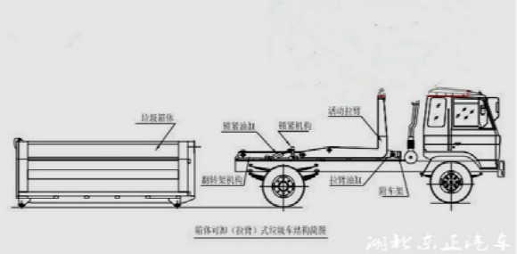 勾臂式垃圾車可將地下垃圾箱內(nèi)的垃圾及垃圾箱一同拉至車上運(yùn)走同時(shí)可自卸,降低了工人的勞動(dòng)強(qiáng)度。該垃圾車的收運(yùn)方式是目前世界上廣泛采用的垃圾收運(yùn)方式,可以實(shí)現(xiàn)一車多 箱,大大降低了配備成本和空間等等;其專用裝置的功能均以汽車發(fā)動(dòng)機(jī)為動(dòng)力,通過液壓機(jī)構(gòu)手動(dòng)或電控來實(shí)現(xiàn)。車輛的箱體采用優(yōu)質(zhì)炭鋼板全密封焊接結(jié)構(gòu),具有強(qiáng)度高、重 量輕、不產(chǎn)生二次污染等優(yōu)點(diǎn)。