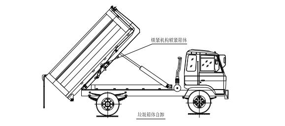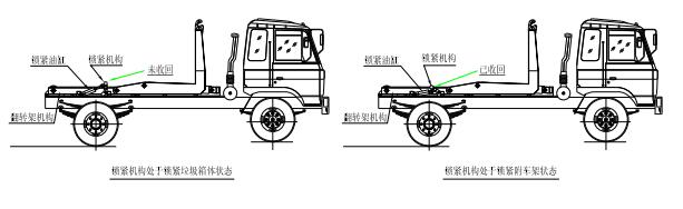 步驟 4.當(dāng)垃圾箱體落放到附車架上后,松開拉臂操作手柄使其回到中位,再將鎖緊鉤操作手柄拉起至鎖緊位置,鎖緊油缸伸出,使鎖緊架翻起并將翻轉(zhuǎn)架與垃圾箱體鎖緊固定,松 開手柄使之回中位;如圖: