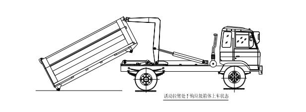 步驟 9. 垃圾箱放置好后,調(diào)整活動(dòng)拉臂鉤與箱體彎鉤位置,使其脫鉤,將拉臂操作手柄推下到落下位置,拉臂油缸收回,活動(dòng)拉臂繞翻轉(zhuǎn)翻轉(zhuǎn)架前鉸鏈軸旋轉(zhuǎn),活動(dòng)拉臂放回到附 車架上,松開取力器垃圾箱放置完成,整車可以運(yùn)輸行駛;