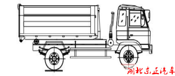 該車是由汽車底盤、拉臂主油缸、附車架、翻轉(zhuǎn)架、支撐腿(選裝)、鎖緊架、鎖緊油缸及多路換向閥等組成。翻轉(zhuǎn)架一端連在附車架上,其另一端設(shè)有活動(dòng)拉臂,中間安裝有 鎖緊系統(tǒng);活動(dòng)臂油缸一端連在活動(dòng)臂上,另一端連接在附車架上;鎖緊機(jī)構(gòu)通過鎖緊油缸的動(dòng)作可以在箱體自卸時(shí)將附車架上的箱體與翻轉(zhuǎn)架及拉臂連為一體,在主油缸伸出時(shí) 形成自卸角,也可以通過鎖緊油缸的收回把翻轉(zhuǎn)架與附車架鎖緊為一體,利用主油缸的收回或伸出使活動(dòng)拉臂將地下的垃圾箱拖拉至附車架上或從附車架上放回到地面。