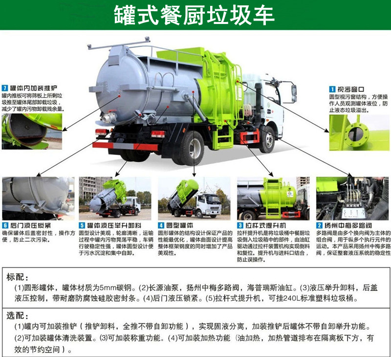 方罐式餐廚垃圾車:弧形廂體,箱體內(nèi)可實(shí)現(xiàn)固液分離,推鏟卸料,后蓋液壓開啟/鎖緊(帶耐磨橡膠密封條密封-后門關(guān)閉后滴水不漏),后門液壓鎖緊防誤操作功能,掛桶式提升機(jī),可配合120升、240升標(biāo)準(zhǔn)垃圾桶使用,清洗裝置(帶水箱、液壓馬達(dá)帶動(dòng)高壓泵)。