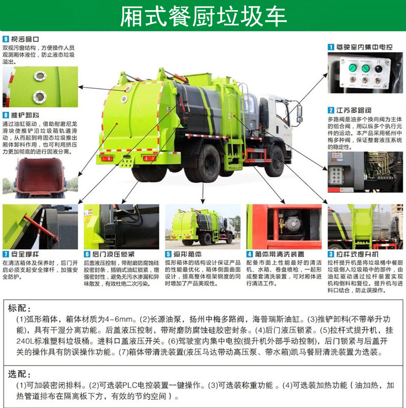 功能配置:箱體液壓舉升卸料,后蓋液壓打開和鎖緊(帶耐磨防腐蝕硅膠密封條密封-后門關(guān)閉后滴水不漏),后蓋液壓雙重鎖緊裝置,掛桶式提升機,可配合120升、240升標(biāo)準(zhǔn)垃圾桶使用。